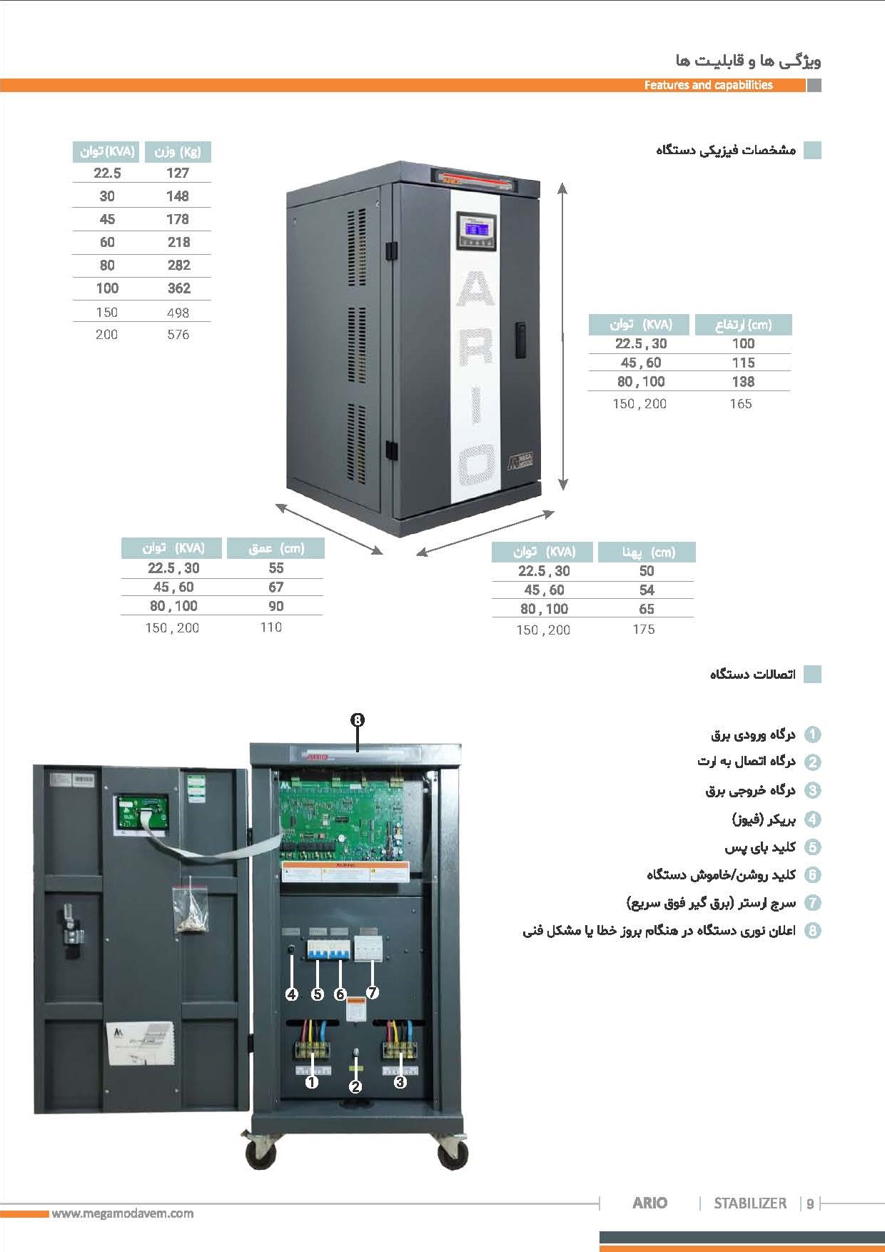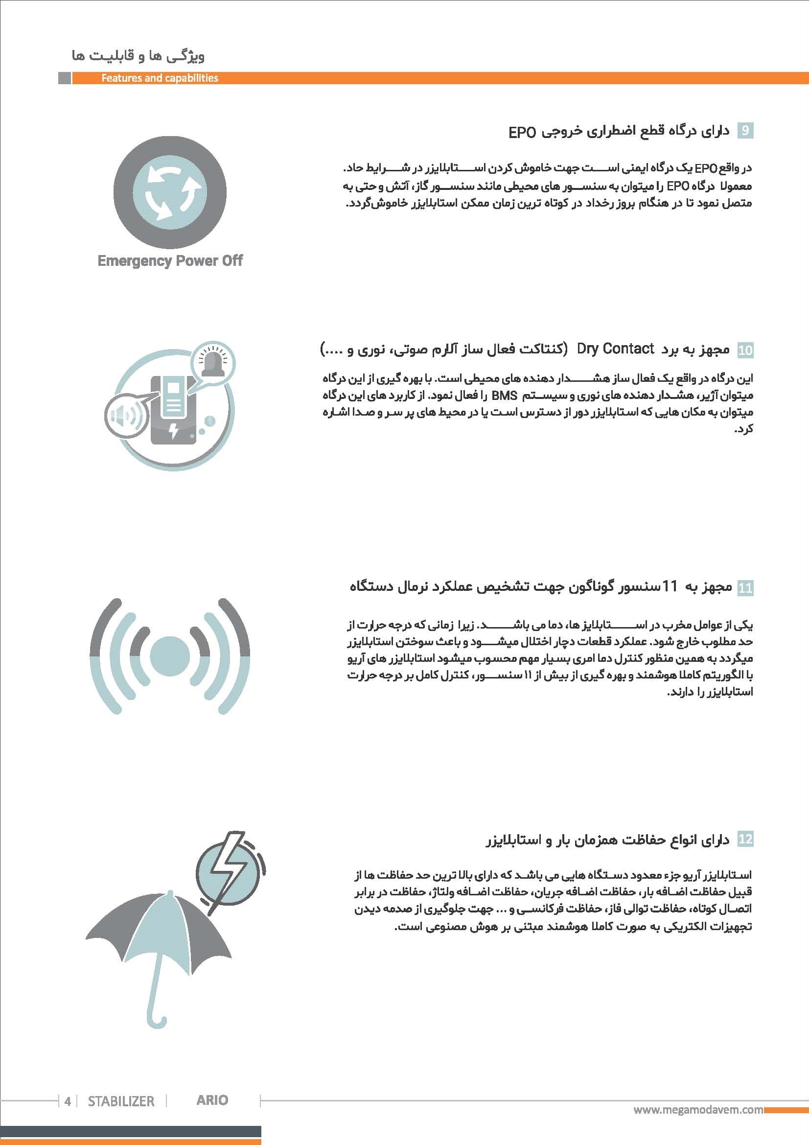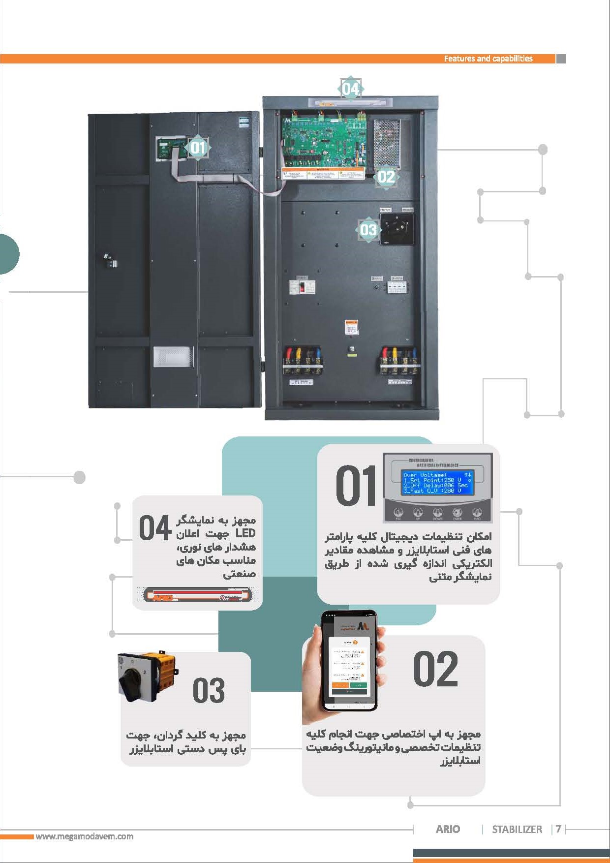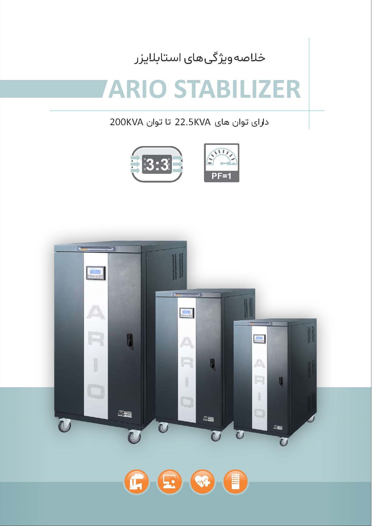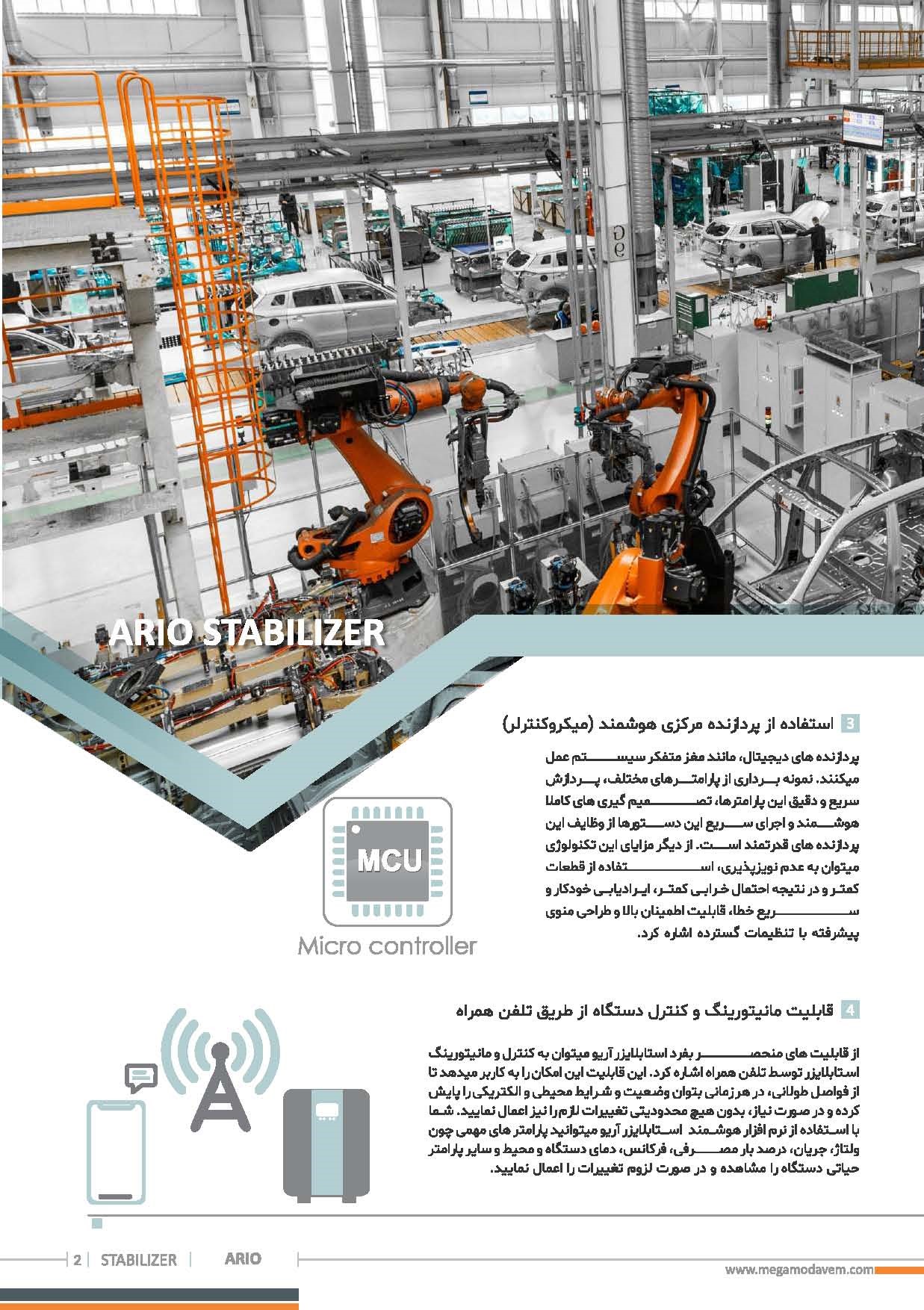 استابلایزرهای سرووموتوری آریو نسل جدید تثبیت کننده های ولتاژ هستند که عملیات تثبیت ولتاژ را با استفاده از هوش مصنوعی و کنترل تماما دیجیتال انجام میدهند. بکارگیری انواع الگوریتم های هوش مصنوعی در این دستگاه، قابلیت های منحصر بفرد و قدرتمندی به این خانواده از دستگاه ها بخشیده است. ثبت رخدادهای صورت گرفته در حافظه دستگاه، تست خودکار و هوشمند دستگاه، تشخیص اتصال نامناسب جاروبک انتقال دهند جریان با سیم پیچ ترانس، تشخیص جریان کشی DC و خرابی درایو موتور، سنجش کیفیت ارت و نول مجموعه، ایرادیابی هوشمند، اتصالات Dry Contact جهت نمایش خطا بصورت آنالوگ، ارسال پیامک به کاربر و گزارش وضعیت عملکردی دستگاه و تمامی پارامترهای کاری آن و ده ها قابلیت هوشمند دیگر از مزایای بکارگیری هوش مصنوعی در این دستگاه ها می باشد. برخلاف سایر دستگاه های روز بازار، دستگاه آریو قابلیت ارائه توان با ضریب توان خروجی 1 وقتی که ولتاژ ورودی دستگاه تا 180 ولت افت پیدا کرده است را دارد. این دستگاه دارای رنج وسیعی از حفاظت ها جهت حفاظت از بار و خود دستگاه می باشد. از این رو طول عمر دستگاه بصورت چشمگیری افزایش یافته است. کاربری این دستگاه ها در مواقعی است که برق ورودی مجموعه از کیفیت مطلوبی برخوردار نیست، برای مثال برق ورودی دارای افت ولتاژ یا اضافه ولتاژ پایداری است. همچنین این دستگاه ها برای بهبود کیفیت برق خروجی ژنراتور ها بسیار کاربردی می باشند.